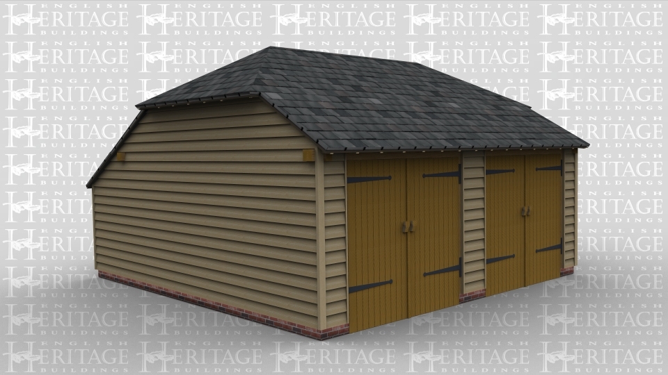 A 2 bay oak framed garage with a pair of iroko garage doors at the front of each bay, there is an internal aisle at the rear and on the right side is a single door in the end of the catslide.