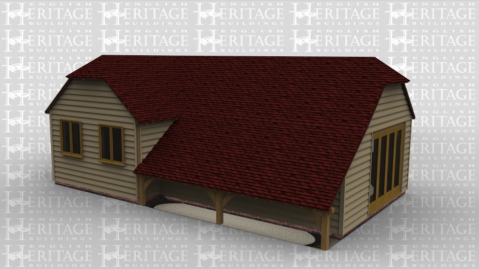 A 7 bay oak frame building made up of 3 frames. The first frame is 2 bays in size with both an internal aisle at the rear and an external aisle extending off that, the left wall has a 4 pane section of full height glazing and a 2 light window and a half glazed doorat the front. The second frame is 4 bays in size with 3 pairs of garage doors at the front, at the rear is a large internal aisle as well as 4 2 light windows. The final frame is a single bay in size with an opening at the front and a full hip roof.