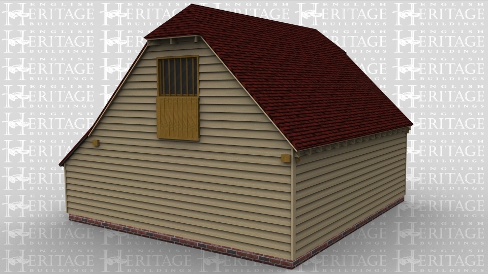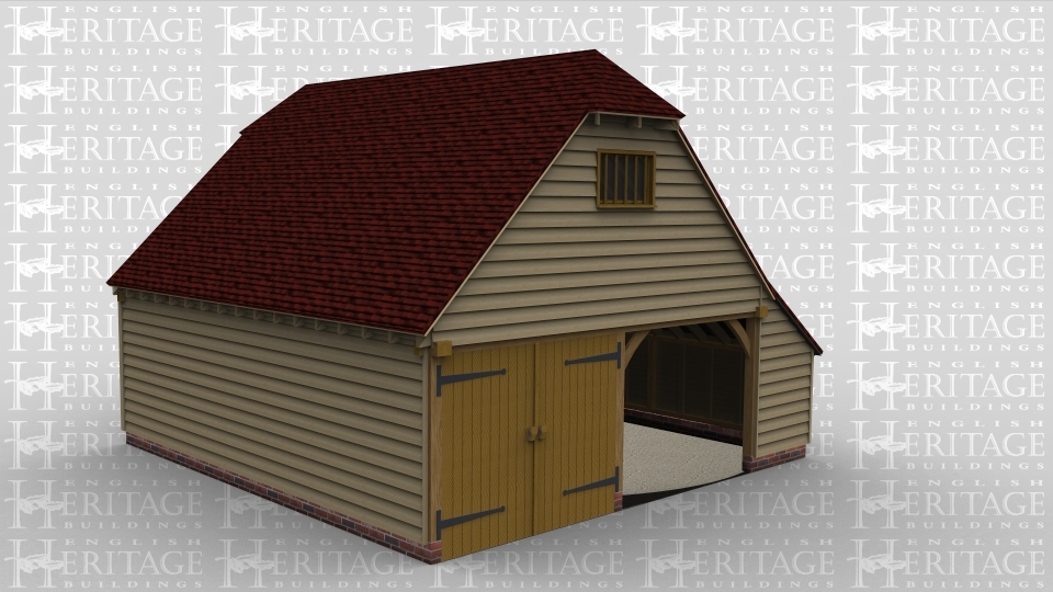A 2 bay oak framed building with an upper floor accessed via an internal staircase. The ground floor has an internal aisle at the front and on the left side there is a pair of iroko garage doors as well as an open area next to it. On the first floor on the left hand side is a mullion window while on the right is a half glazed door.