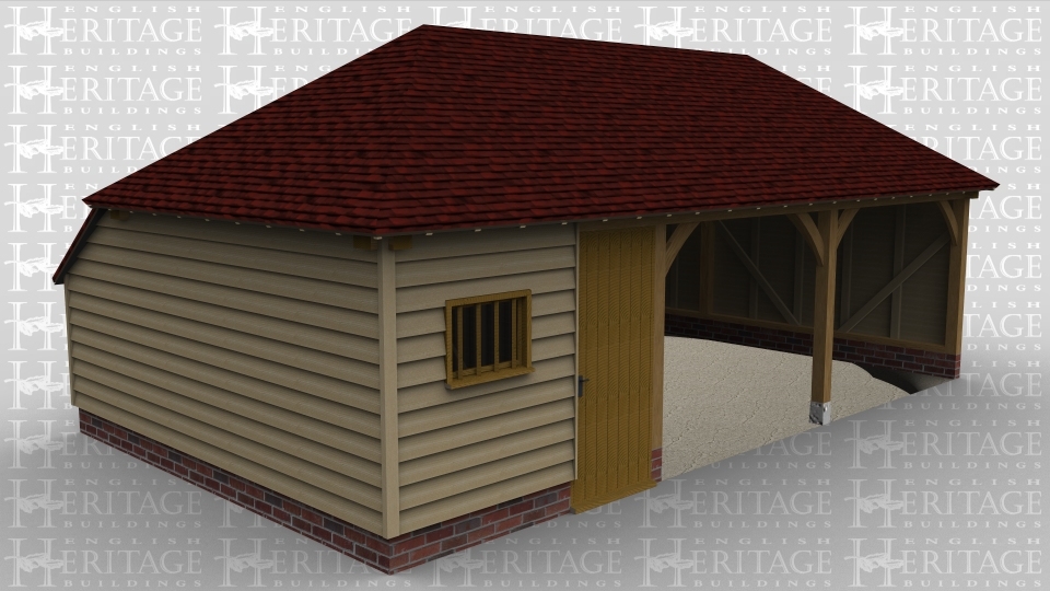 A 3 bay oak framed garage with 2 of the bays left open at the front while the third bay has a solid single door and a mullion window at the front and there is an internal aisle at the rear.