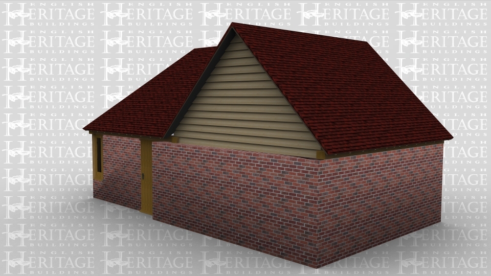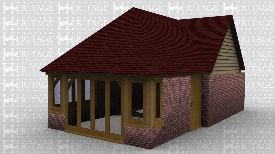 A 2 bay oak framed leisure building made up of 2 frames. The first frame has a solid single door and a single pane of garden room glazing at the front while on the left are 2 panes of garden room glazing with a section of full height glazing between the 2 to allow plenty of natural light into the building, the right side of the frame has another section of garden room glazing. The second frame has a solid brick wall on all sides and has a gable end on the left and the right.