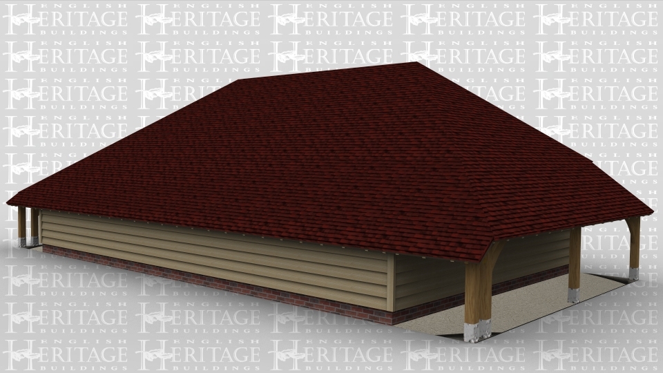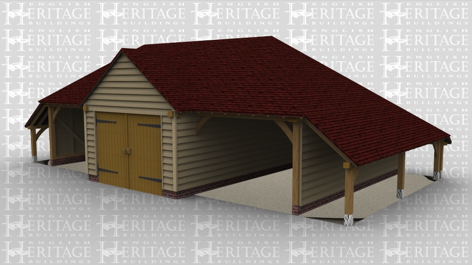 A 3 bay oak framed garage with the left and right bay open at ther front while the middle bay is a pair of iroko garage doors housed below a barn entrance and there is an external aisle on both the left and right side of the building.