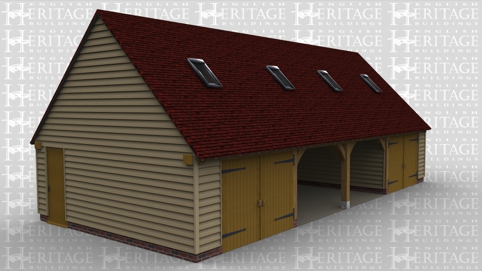 A 4 bay oak framed garage with an upper floor. On the ground floor there is a solid single door on the left and right wall of the building. At the front the left and right bay are both enclosed with a pair of iroko garage doors while the 2 middle bays are open at the front. On the first floor there is a rooflight at the front of each bay to allow plenty of natural light into the frame.