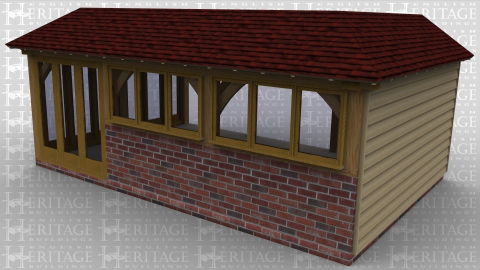 A 3 bay oak framed leisure building with the rear left open to allow it to attach to an existing building, the left wall is made up entirely of full height glazing as well as there being 3 more panes at the front to allow plenty of natural light into the frame. There is also 2 windows at the fron each with 3 panes sitting on a brick wall.