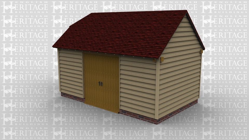 A 3 bay oak frame building with a barn hip roof on the left and a gable roof on the right with a pair of iroko garage doors at the front.