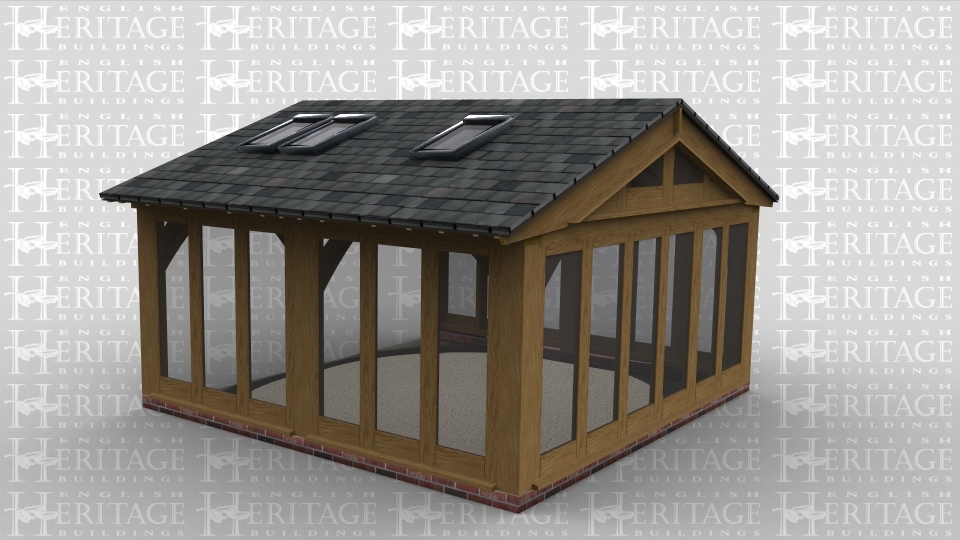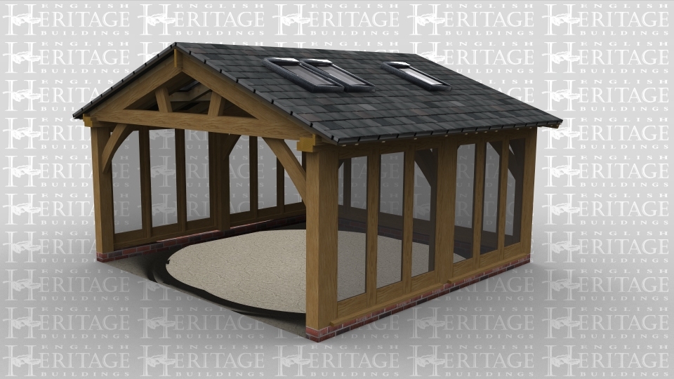 A 2 bay oak framed garden room with oak glazing all along the left rear and front wall to allow plenty of natural lighting as well as the glazed gable end and the 6 rooflights above while the right side is left open to allow it to attach to an existing building