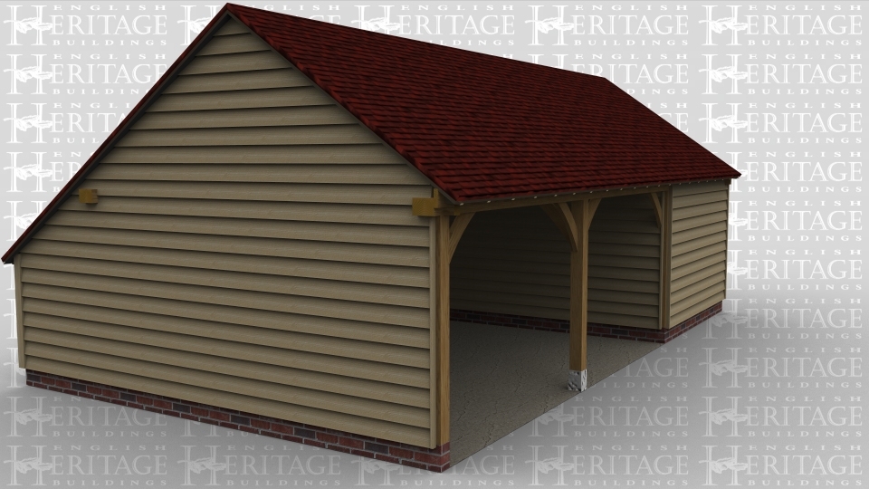 A 3 bay oak framed garage with 2 of the bays left open at the front with the third bay enclosed with a solid single door on the right and a 4 light window, this building has a gable roof on the left and right with an internal aisle at the rear.