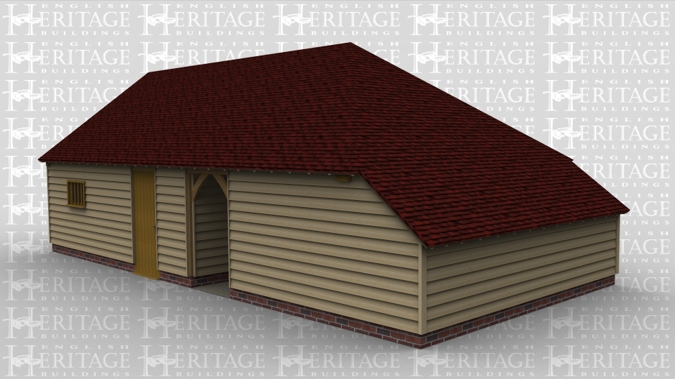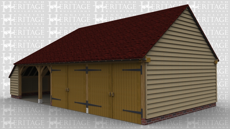 A 3 bay oak framed garage with an internal aisle on the left hand side, the left hand bay is open at the front as well as an open walkway at the rear. The second and third bays are enclosed at the front with a pair of iroko garage doors while at the rear is a mullion window and a solid single door.