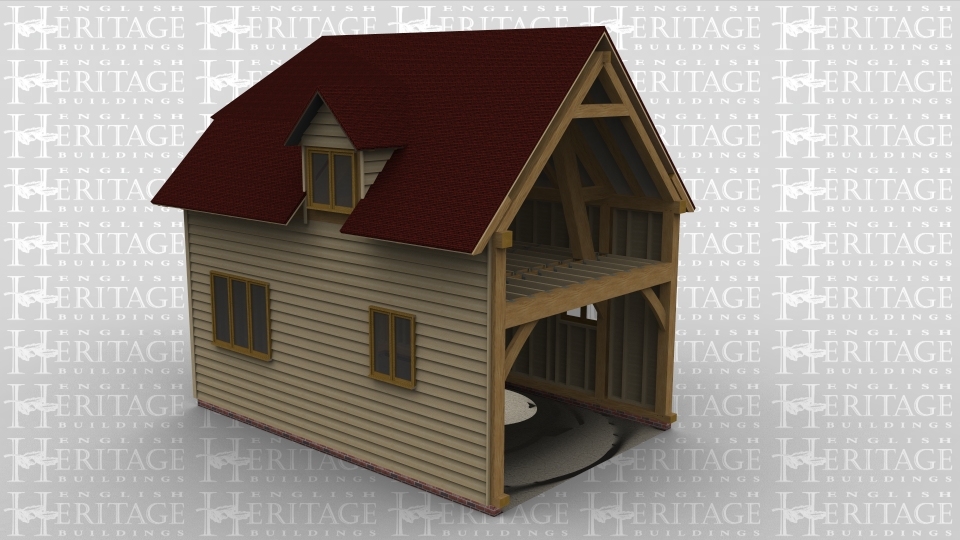 A 3 bay sling brace oak framed home extension with the right wall left open to allow it to attach to an existing building. On the ground floor there is a 2 light and a 3 light window at the front as well as at the back, on the first floor there is a dormer window at the front housing a 2 light window while at the rear there is a rooflight to allow plenty of natural light in.