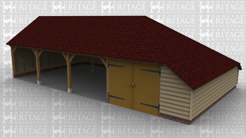 A 4 bay oak frame garage with 3 bays left open at the front while the fouth has a pair of iroko garage doors at the front with an internal aisle at the rear and right hand side..