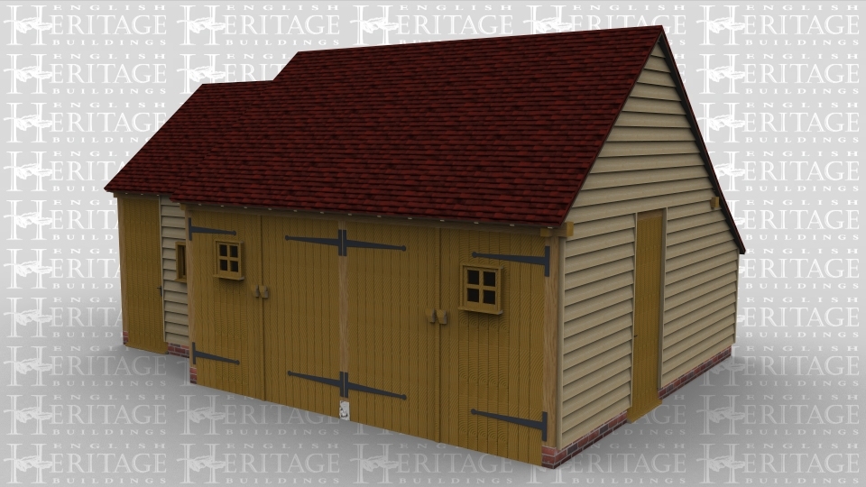 A 3 bay oak framed building made up of 2 frames . The first frame is a single bay in size with a solid single door and a mullion window at the front with an internal aisle at the rear. The second frame is 2 bays in size with 2 pairs of garage doors at the front each with a small square window in.