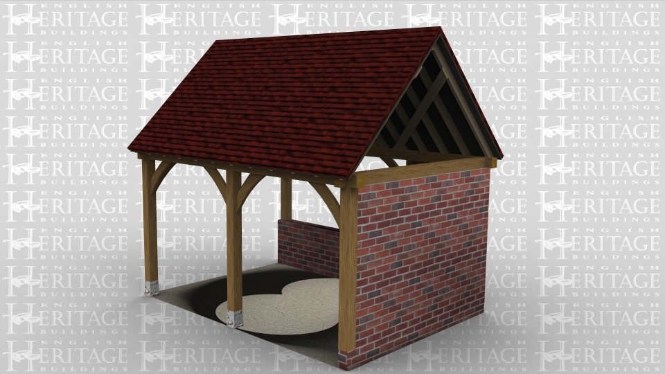 A 2 bay oak framed building with a gable ended roof no both the left and right with a full height solid brick wall on the right and a dwarf wall at the rear.