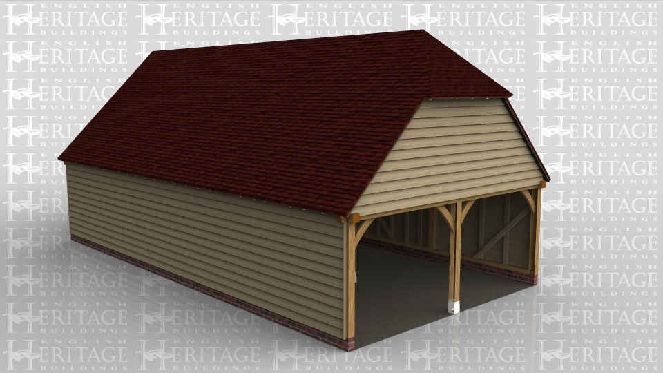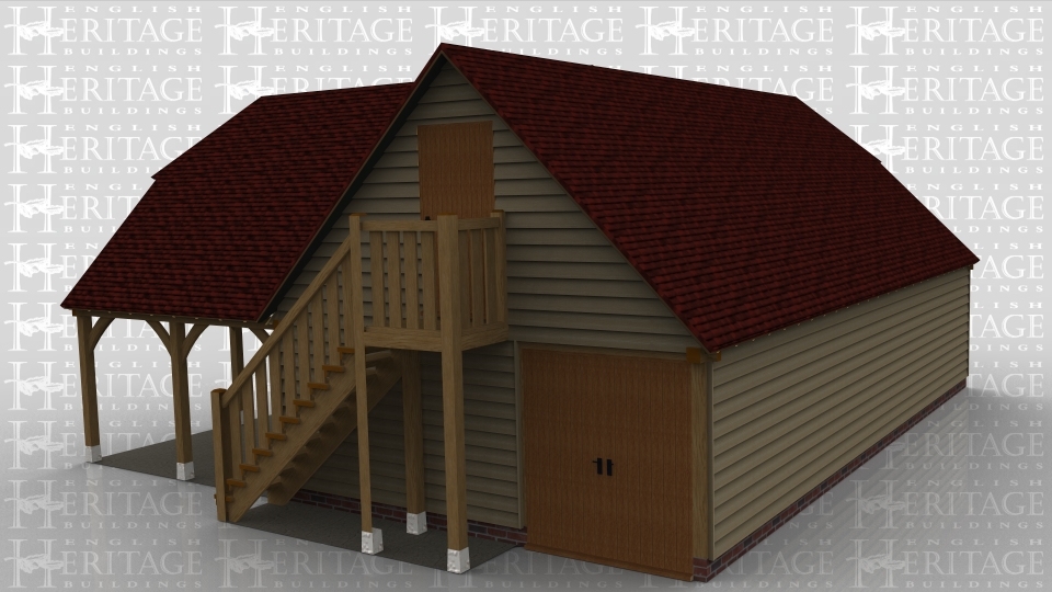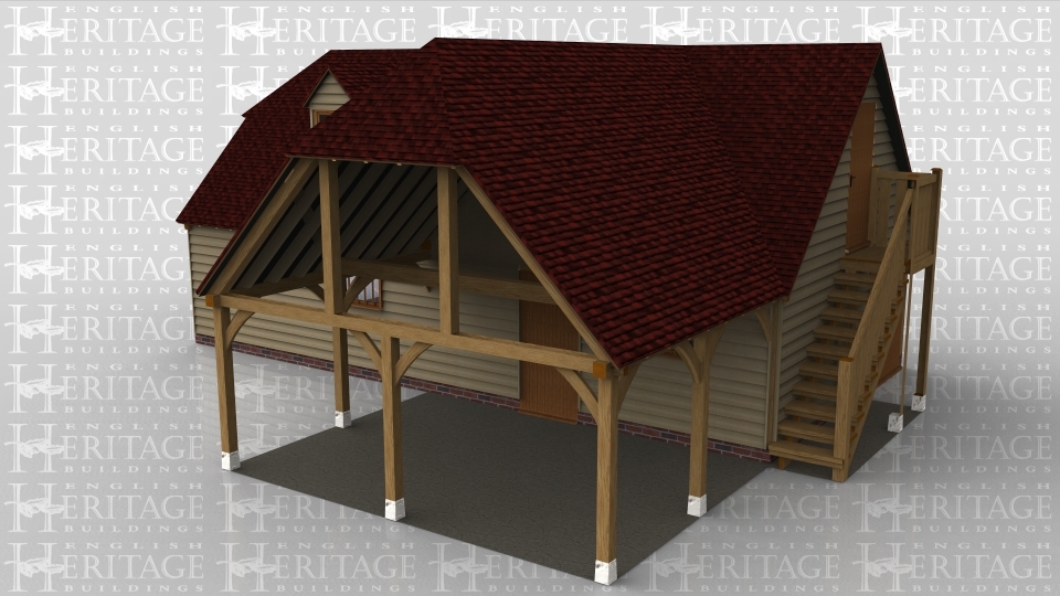 A 10 bay oak framed building made up of 2 frames. The first frame is 2 bays in size and is open on all sides with a barn hip roof on the left and connecting to the other frame on the right. The second frame is 8 bays in size, 4 bays on the ground floor and 4 bays on the first floor. The first floor is open on the left while at the front is a mullion window either side of a solid single door. On the right hand side there is a pair of iroko doors and an external oak staircase leading to the first floor. On the first floor there is a solid single door on the right while at the front there is a dormer housing a 2 light window to allow the natural light into the first floor of the frame.