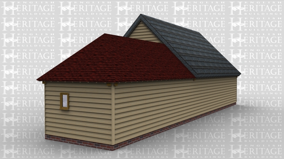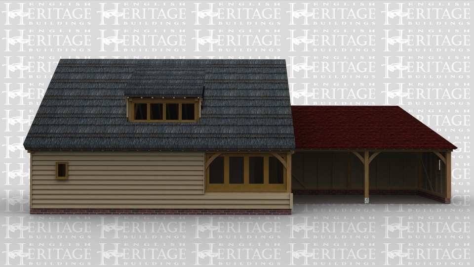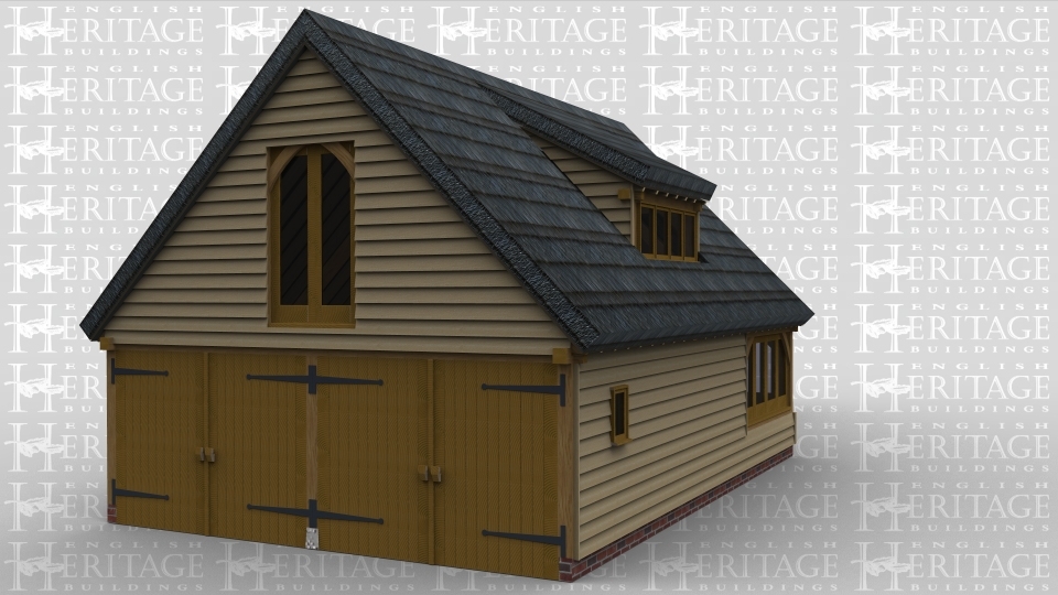 An 8 bay oak framed building made up of 2 frames. The first frame is 6 bays in size with 3 bays on the ground floor and 3 bays on the first floor. The ground floor has 2 pairs of iroko garage doors on the left while at the front there is a 4 pane section of garden room glazing and a single square window, the right hand side of the frame has a further 4 panes of garden room glazing to allow plenty of natural light into the building, there is a also a solid single door linking the 2 frames. On the first floor on the left hand side is a julliet window and at the front is an eyebrow window made up of 4 panes to allow the light into the the first floor. The second frame is open at the front with a square window on the right wall.