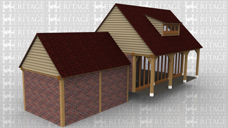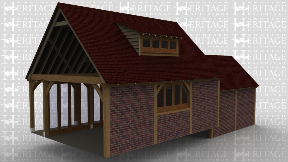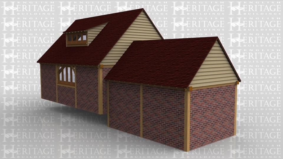 An 8 bay oak framed building made up of 2 frames. The first frame is 2 bays in size with solid brick walls around the entrie frame with an opening on the right to allow access to the other frame. The second frame is 6 bays in size with 3 bays on the ground floor and 3 bays on the first floor. On the ground floor the front wall is set back to create a walkway, on the front wall there is full height glazing along the whole area to allow plenty of natural light into the ground floor area. The right side is left open to allow the frame to attatch to an existing building while at the rear, there is a solid brick wall with 4 panes of garden room windows . On the first floor there is a 4 pane eyebrow window at the front and the rear to allow plenty of natural light into the first floor of the building.