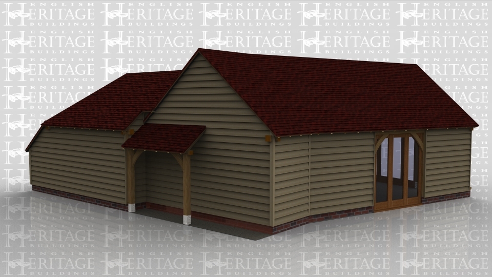 A 7 bay oak framed building made up of 2 frames. The first frame is 3 bays in size and has 4 panes of full height glazing at the rear and another 4 pane section on the left, the front wall is made up entirely of full height glazing to allow plenty of natural light into the building. The second frame is made up of 4 bays with an internal solid single door on the internal partition, this frame has 2 bays open at the front with an internal aisle on the right and at the rear 2 bays have an internal aisle while 1 has an external logstore area.