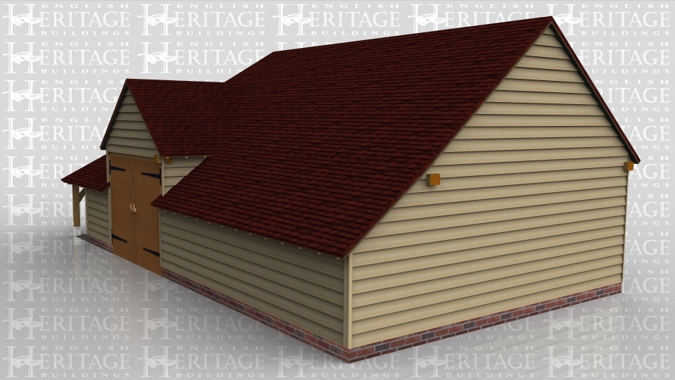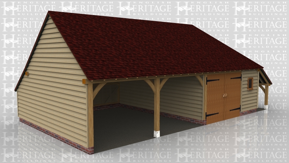 A 4 bay oak frame building with 2 bays left open at the front while one has a pair of iroko garage doors and the other is boarded with a sqaure window. This garage has an external aisle on the right and an internal aisle at the rear, there is also a barn entrance at the rear with a pair of iroko garage doors.