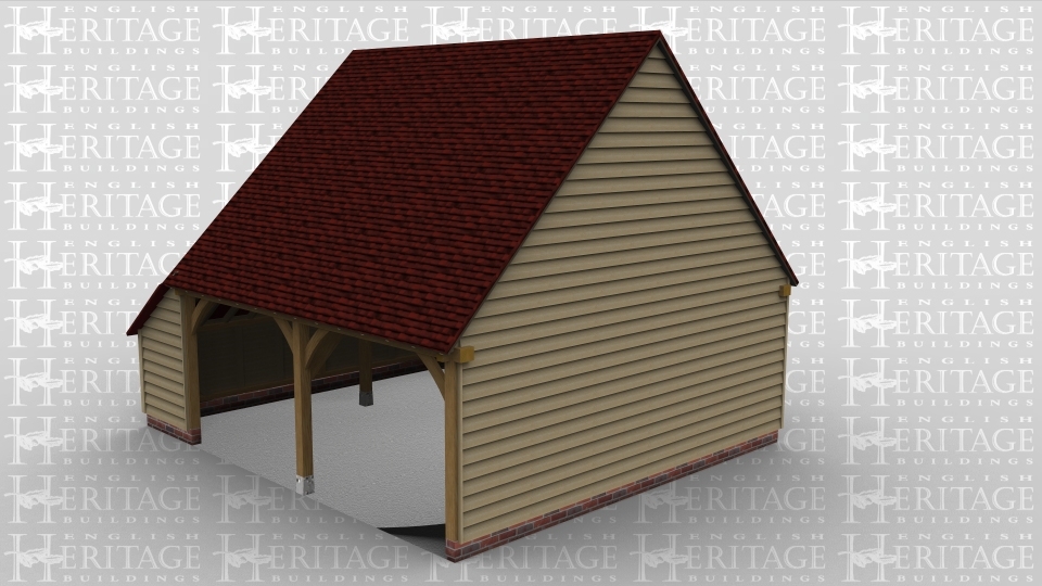 A 2 bay oak framed garage open at the front with an internal aisle on the left.