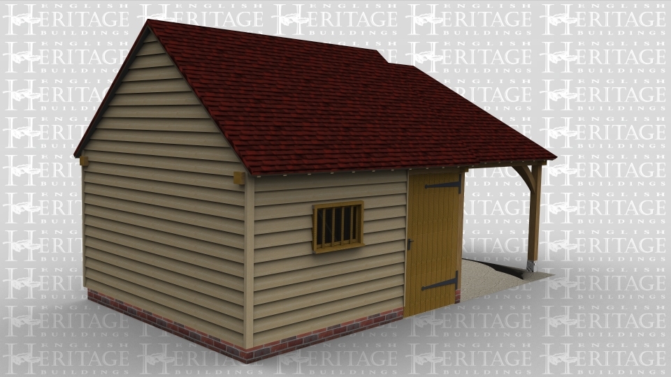 A 3 bay oak framed building made up of 2 frames. The frist frame is 2 bays in size with a mullion window and a solid single door at the front. The second frame is a single bay in size and is open on the right and at the front.