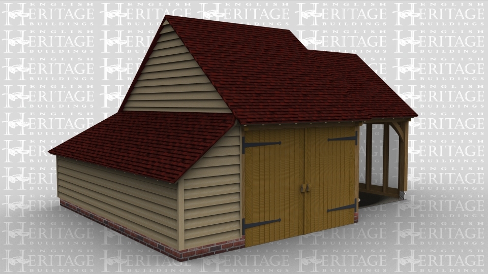 A 2 bay oak framed building made up of 2 frames. The first frame is a single bay in size with a pair of iroko garage doors at the front and an internal aisle on the left, there is also a solid single door on the right linking the 2 frames. The second frame is also a single bay in size with the front left open while the right wall is made up of oak full height glazing to allow plenty of natural light in and there is also an internal aisle at the rear.
