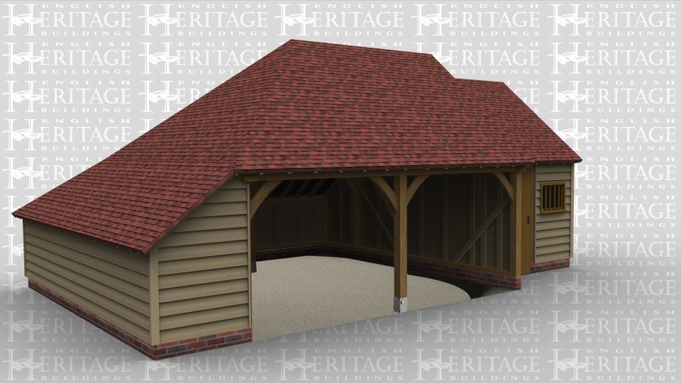 A 3 bay oak framed garage made up of 2 frames. The first frame is 2 bays in size with the front left open with an internal aisle on both the left and rear. The second frame is a single bay in size also with an internal aisle at the rear as well as a solid single dor and a mullion window at the front.