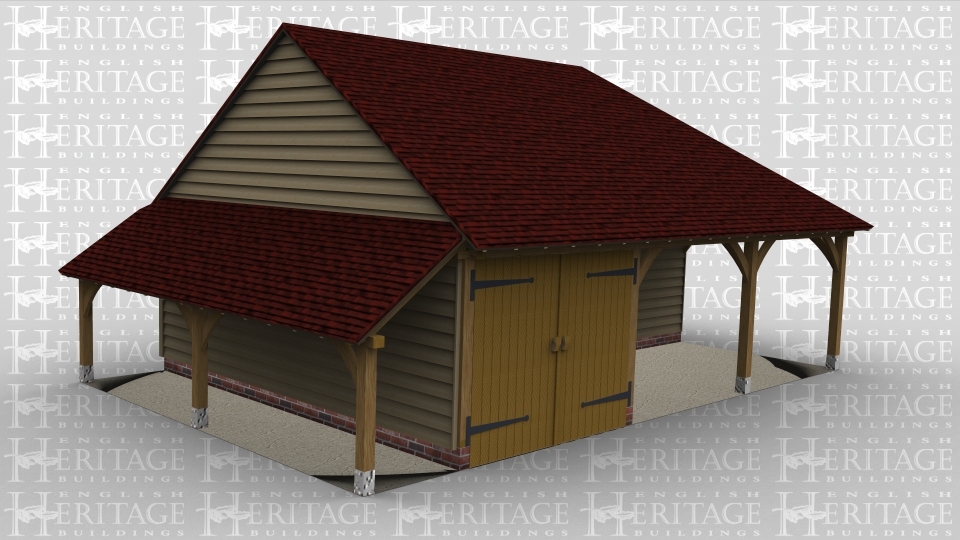 A 3 bay oak framed garage with a pair of iroko garage doors at the front of the left hand bay while the other 2 bays are set back with a pair of iroko garage doors on the right. There is also an external aisle on the right.