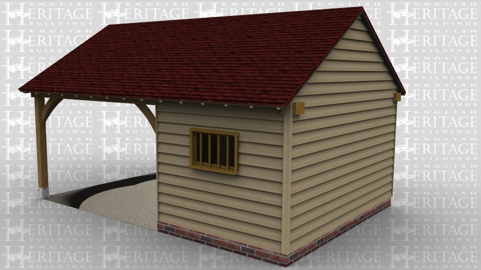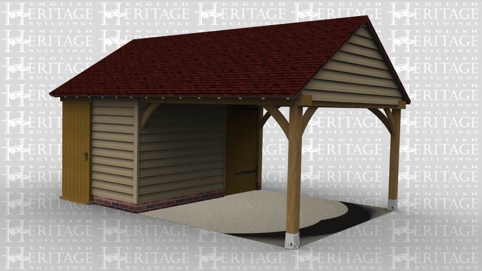 A 2 bay oak framed leisure building with a solid single door at the front of the left hand bay as well as another solid single door on the internal partition on the right of the bay. there is a mullion window at the rear and the other bay is open on all sides.