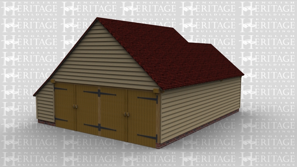 A 3 bay oak frame garage made up of 2 frames. The first frame is 2 bays in size. It has an internal aisle at the front with a 5 pane section of full height glazing on the left to allow plenty of natural light in the room, on the right side there are 2 pairs of iroko garage doors. The second frame is a single bay in size with a gable roof on the left and at the front is asolid single door.