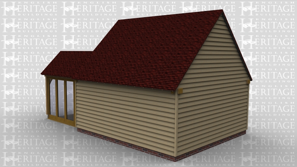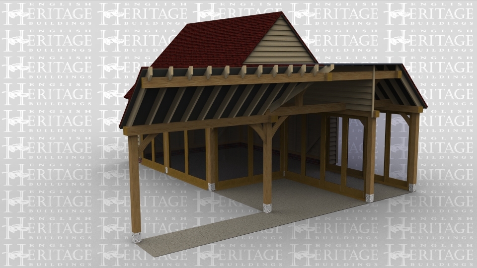 A 5 bay oak framed extension made up of 3 frames. The first frame is 2 bays in size with 4 panes of full height glazing at the front and a further 2 on the right side to allow plenty of natural light into the building. The second frame is also 2 bays in size open at the front with 4 panes of full height glazing between the 2 bays and also another section of full height glazing on the right side of the building while the left side is open. The final frame is 1 bay and is a walkway that attatches on the front to an existing building.