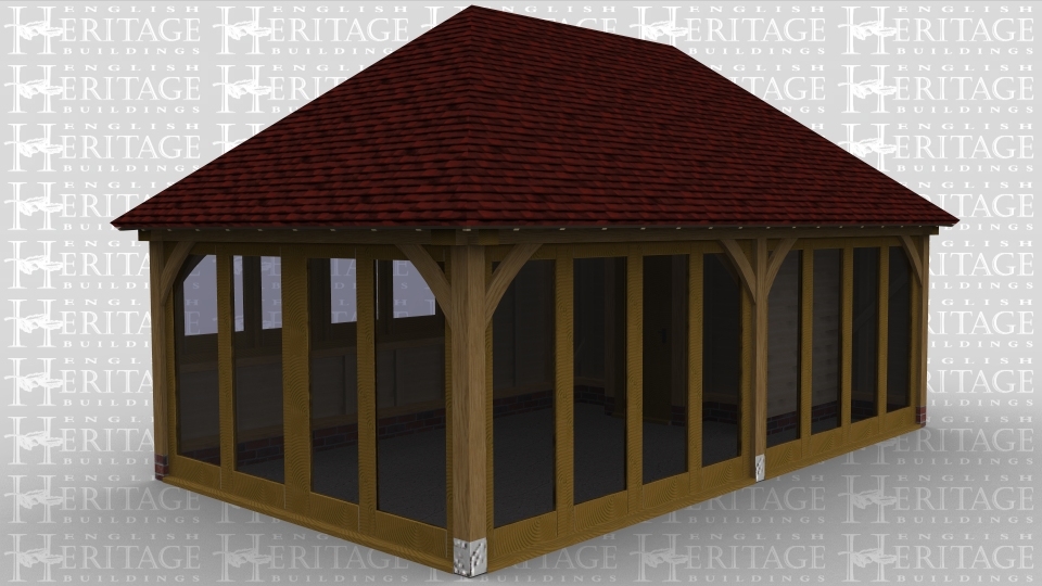 A 2 bay oak framed leisure building with both the lft and front wall made up entirely of full height glazing while at the rear there is 4 panes of garden room style windows to allow plenty of natural light into the building.