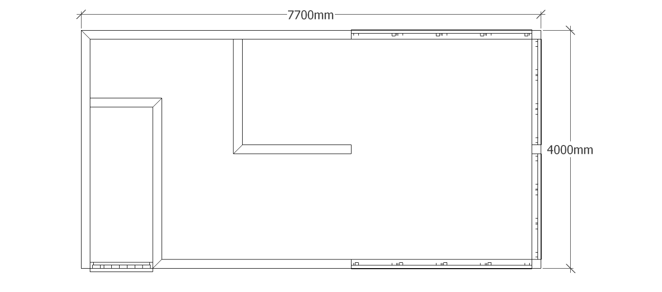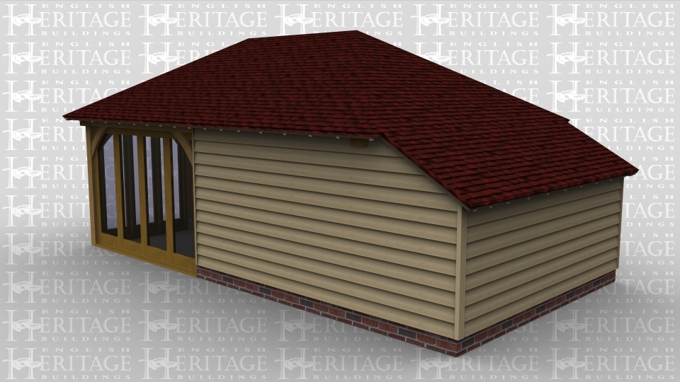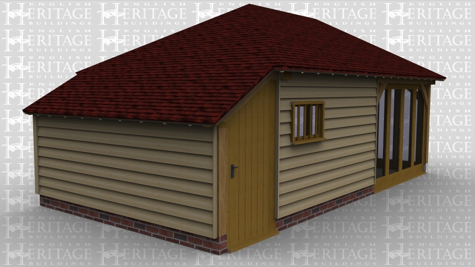 A 2 bay oak framed building with an internal aisle on the left with a solid single door at the front of the aisle. Also at the front of the frame is a mullion window as well as a 4 pane section of full height glazing while on the right there are a further 8 panes and 4 more at the rear to allow plenty of natural light into the building.