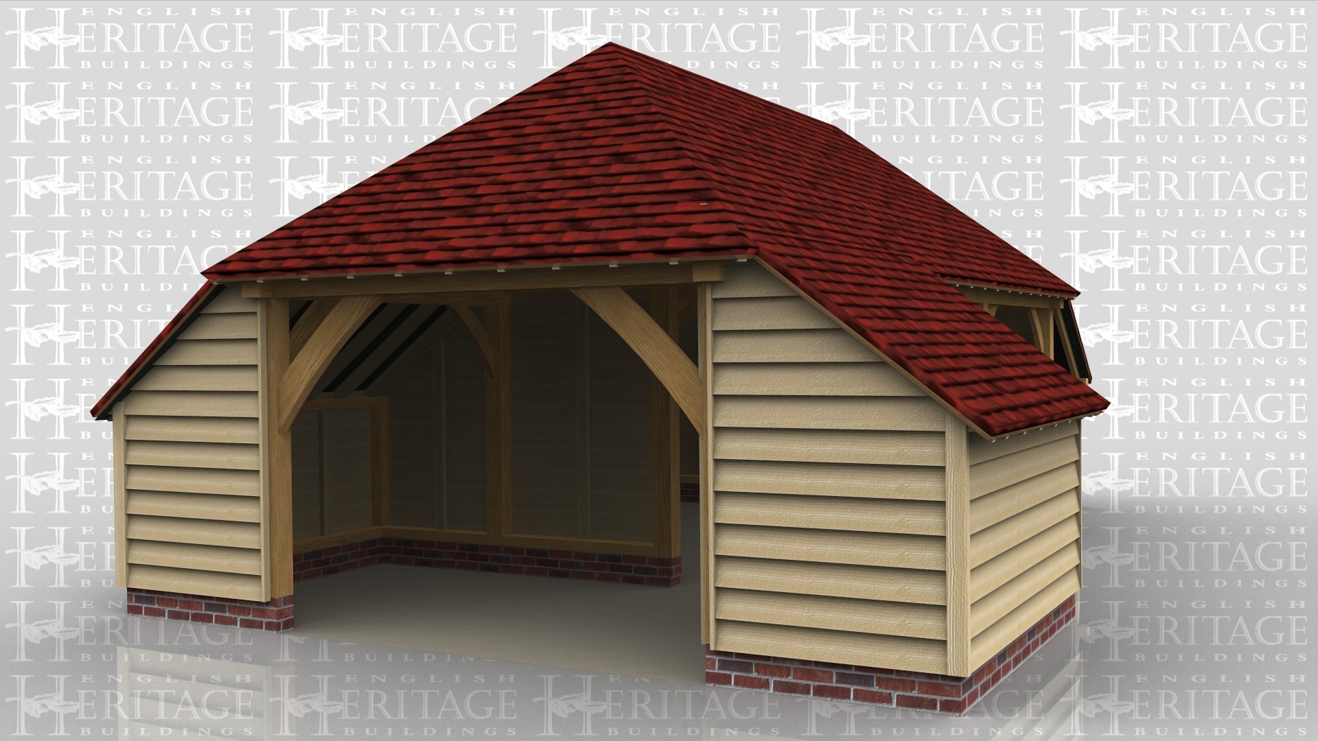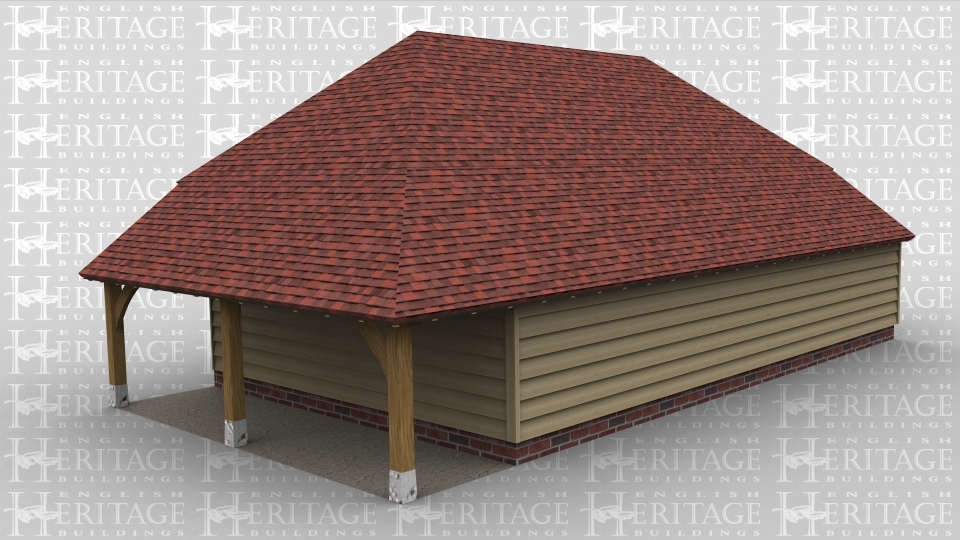 A 3 bay oak framed garage with an internal aisle at the front of the left hand bay with a solid single door in the right of the aisle. The other 2 bays are open at the front with an external aisle on the right and an internal aisle at the rear.On the left there is a barn hip roof and is open at the side.