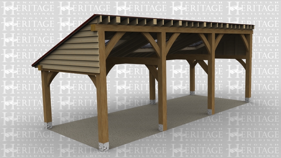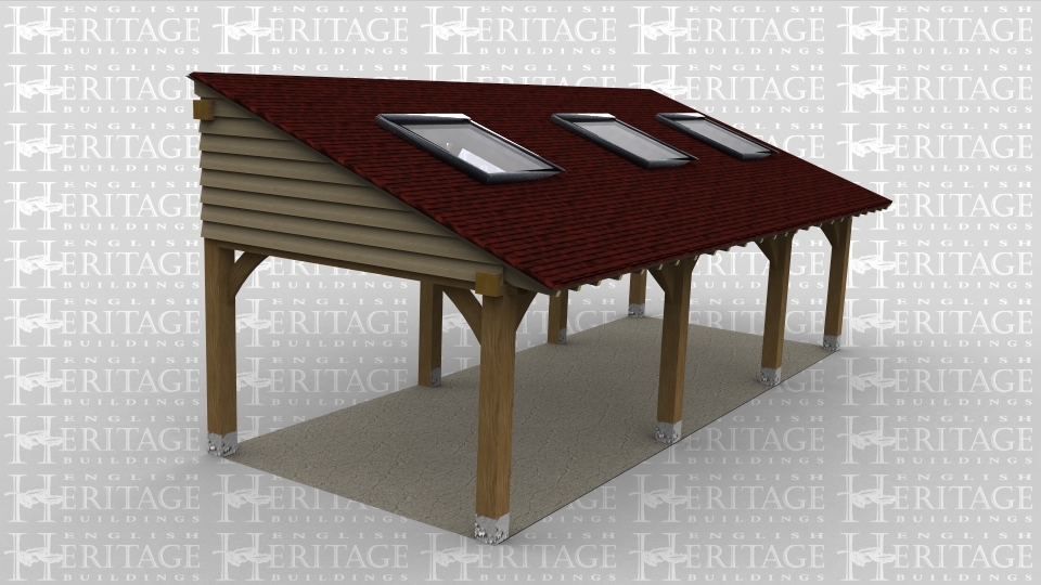 A 3 bay oak framed monopitch extension open on all sides with 3 velux rooflights.